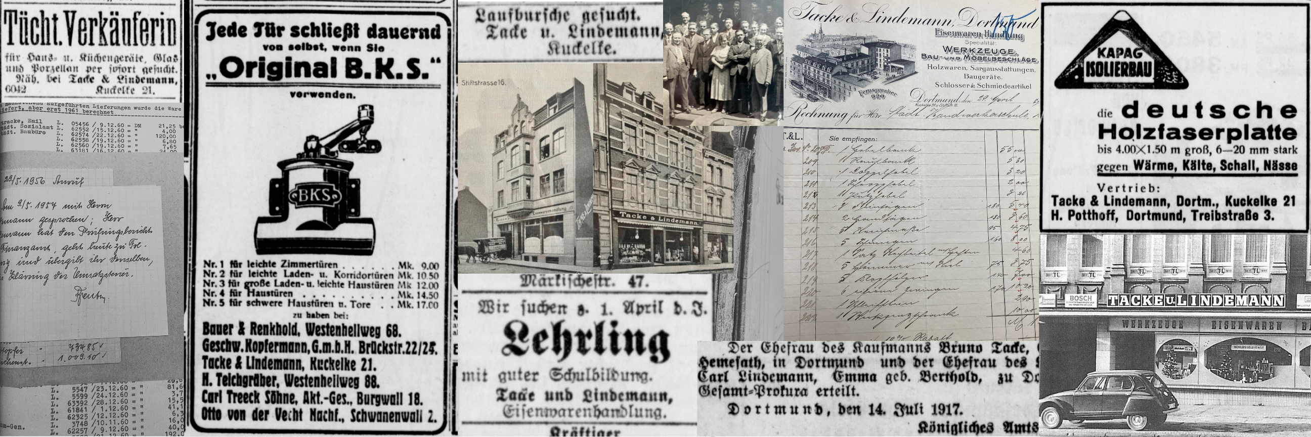 1899 gründeten Bruno Tacke und Carl Lindemann einen Eisenwarenhandel in bester Dortmunder Innenstadt Lage. An der Kuckelke boten sie zu Beginn alles an, was die Handwerker der Zeit für ihre Arbeit brauchten: Schrauben, Muttern, Ketten, Beschläge und Werkzeuge. Dazu wurden Schmiedeartikel und Holzwaren für Schreiner und Privatpersonen angeboten.